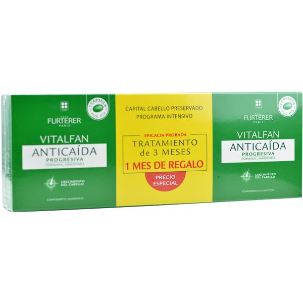 Ideal para tratar la caída progresiva del cabello. Se trata de una pérdida de densidad capilar desde hace más de 6 meses. Suele haber antecedentes familiares de pérdida capilar, su pelo pierde abundancia y su capital se reduce.\r\n\r\nTrata con efectividad aquella caída debida a causa hormonal y hereditaria. El consumo debe acompañarse de una alimentación variada y equilibrada y un estilo de vida saludable.\r\n\r\nVITALFAN Anticaída progresiva asocia activos vegetales y vitamina B8, que contribuye al metabolismo de los macronutrientes, como la queratina del pelo; vitamina B6, que ayuda a regular la actividad hormonal; vitamina E y zinc, de acción antioxidante.\r\n\r\nYa puedes comprar este complemento alimenticio de Rene Furterer en nuestra farmacia online\r\n\r\n